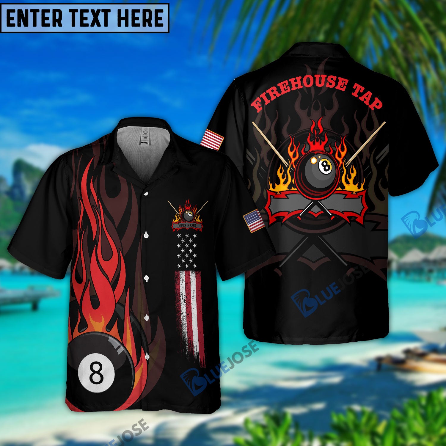 BlueJose Flame Billiards Pool Firehouse Tap Personalized Name Hawaiian Shirt