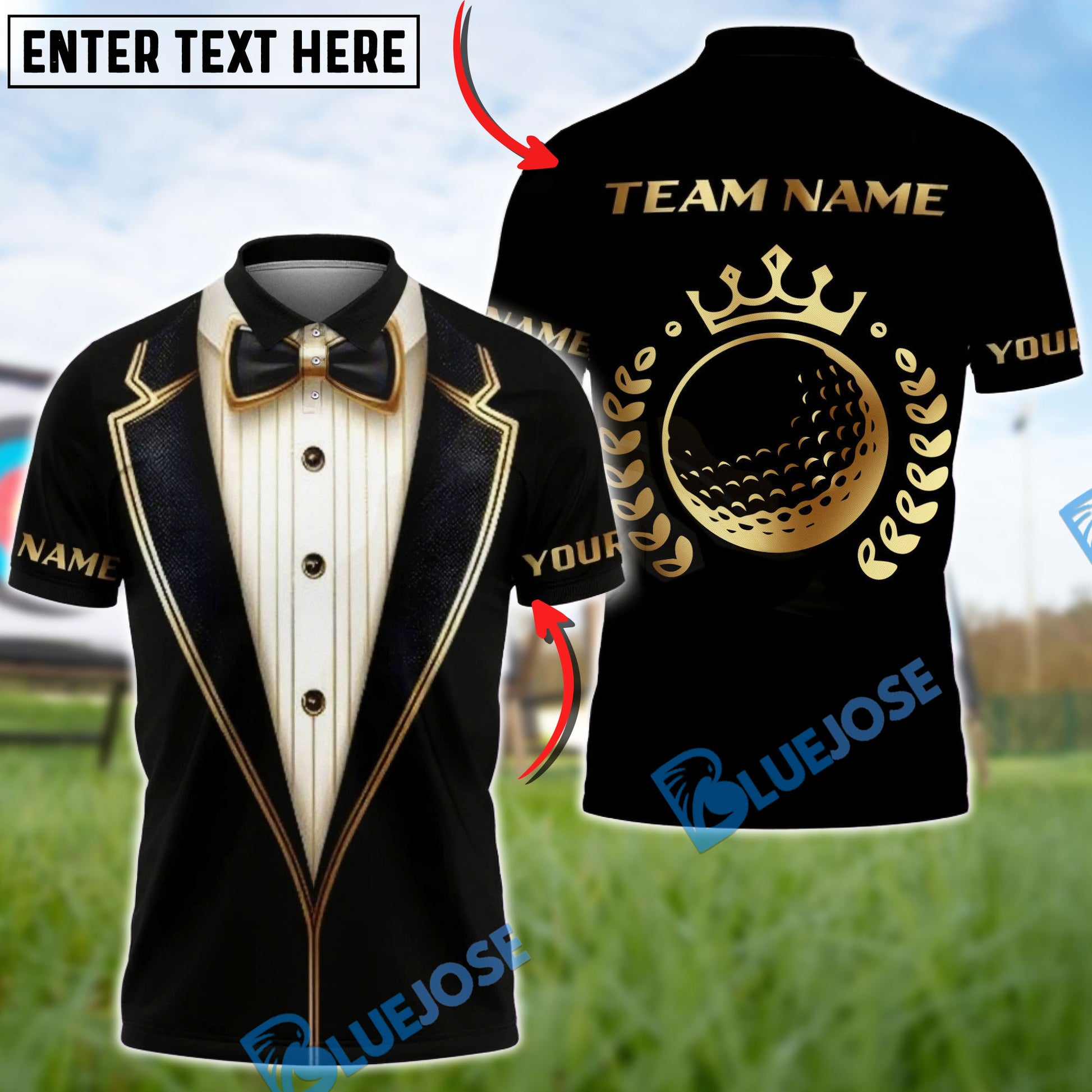 BlueJose Golf Luxury Tuxedo Gold Ball Crown Customized Name, Team Name Shirts