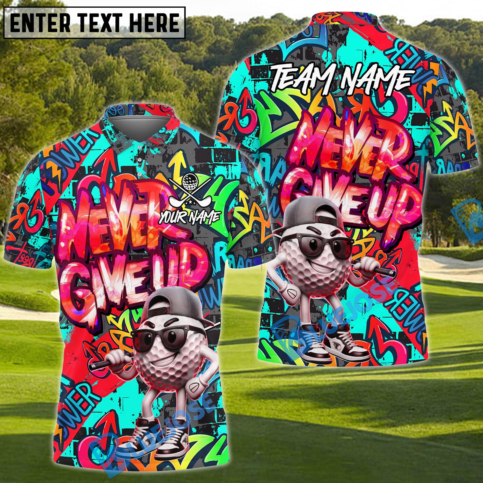 BlueJose Never Give Up Graffiti Golf Shirt Customized Name, Team Name 3D Shirts (4 Colors)