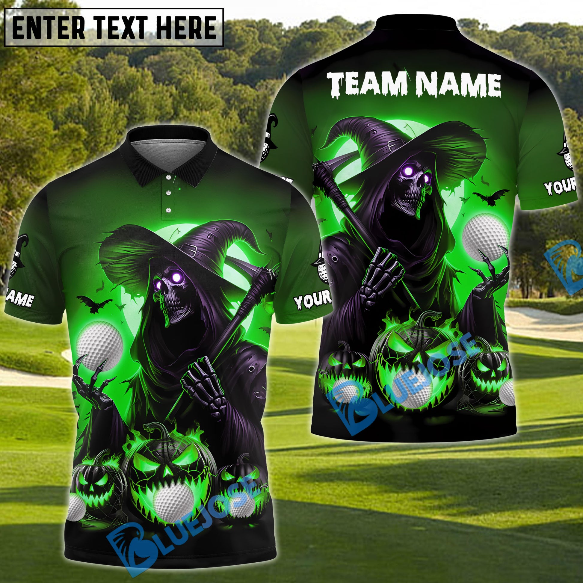 BlueJose Grim Reaper Pumpkin Golf Polo Shirt, Customized Name, Team Name 3D Shirts (4 Colors)