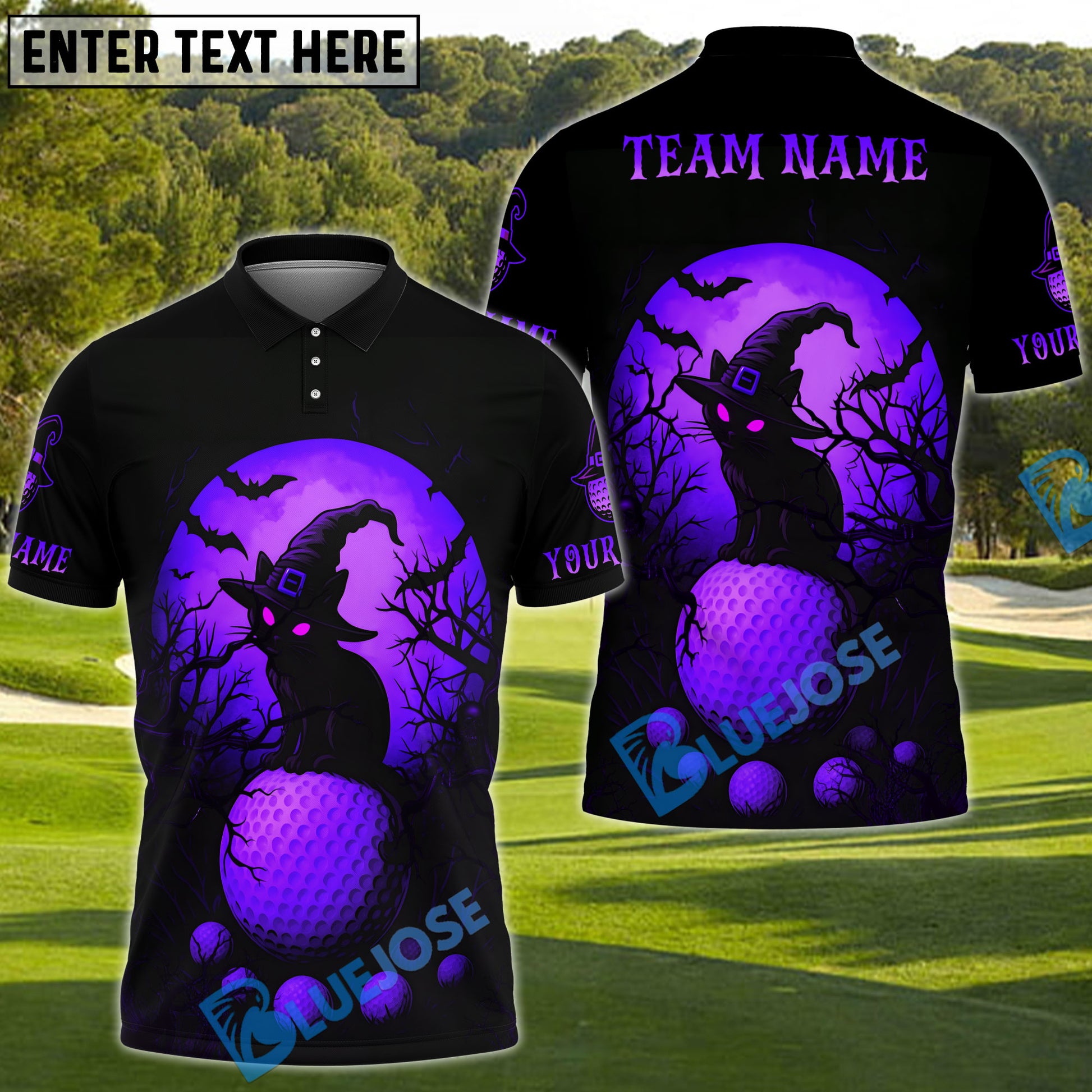 BlueJose Halloween Black Cat Golf Polo Shirt, Customized Name & Team Name 3D Shirts (4 Colors)