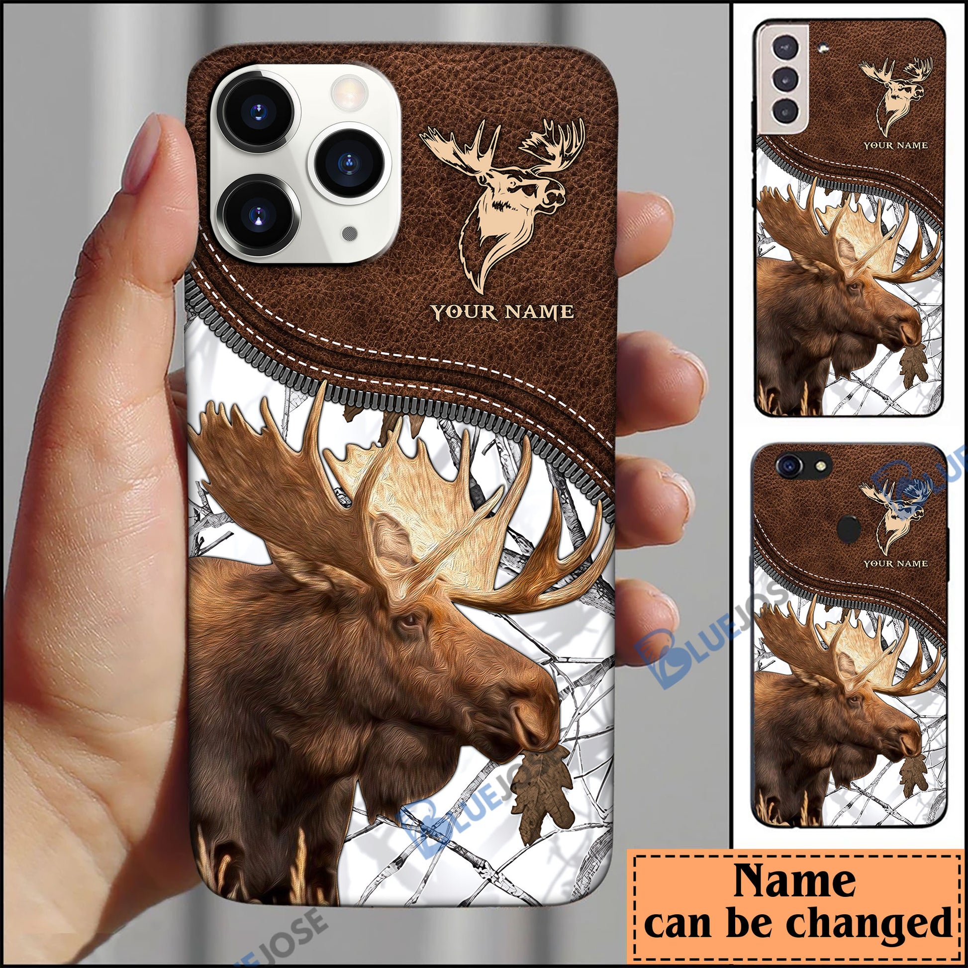 BlueJose Moose Hunting Leather Pattern Personalized Name Phone Case (4 colors)
