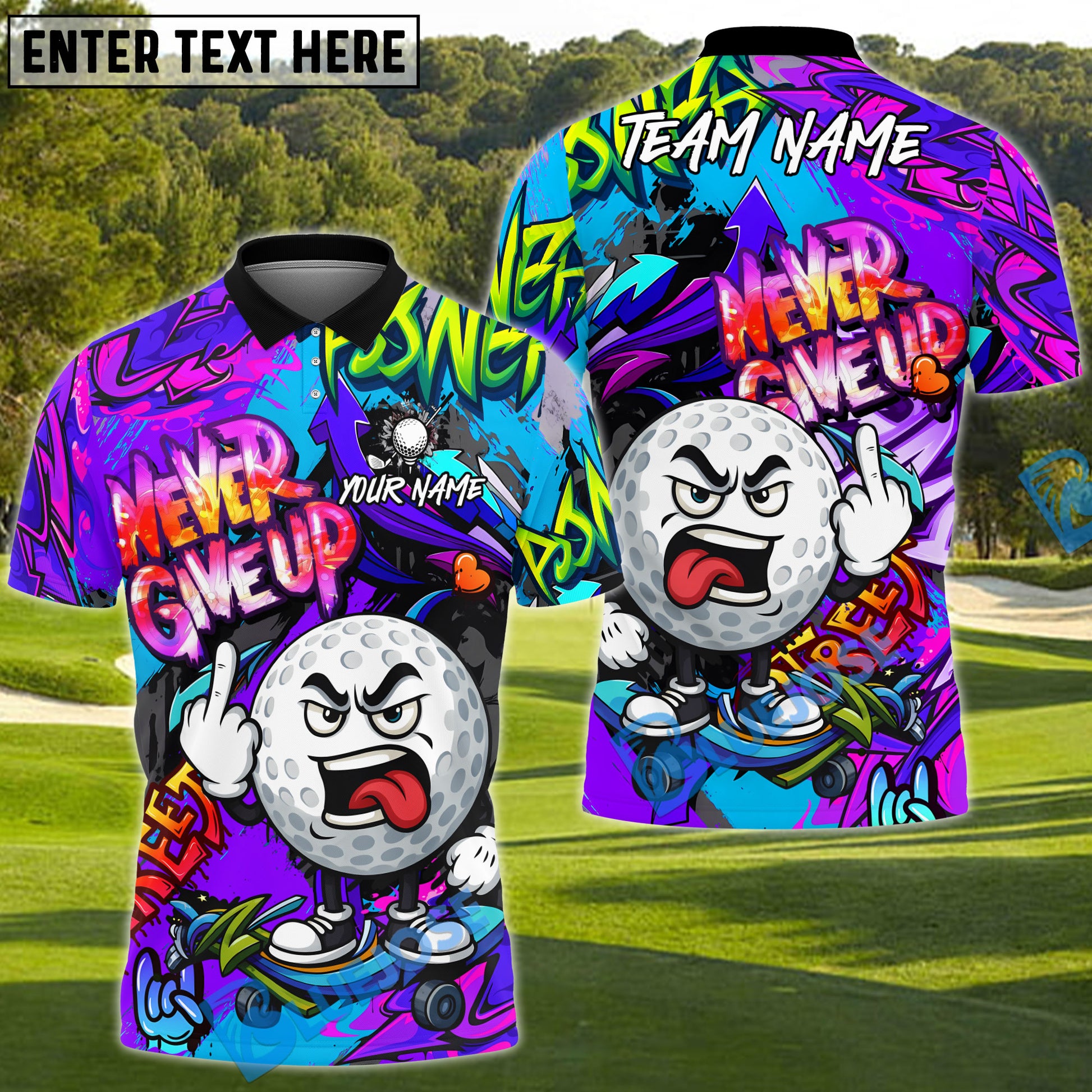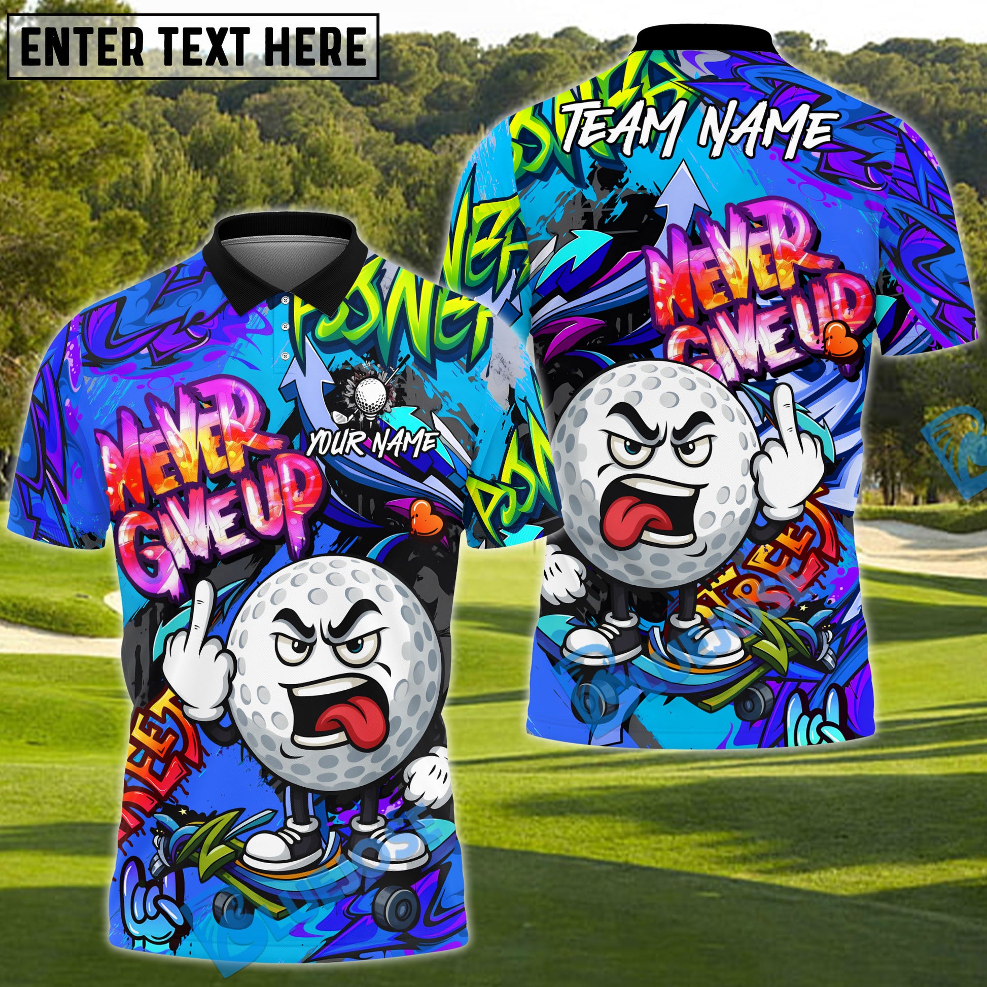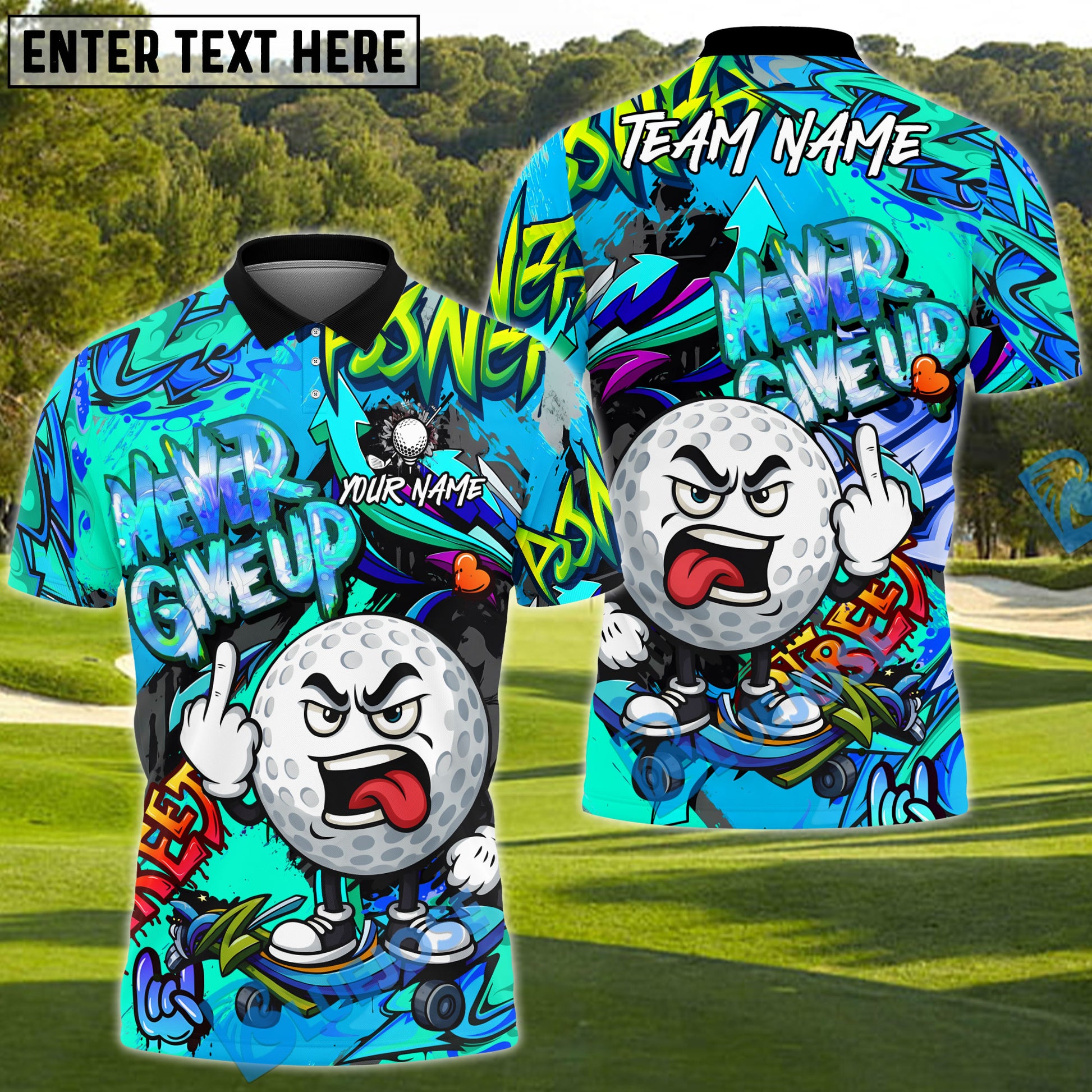 BlueJose Never Give Up Graffiti Golf Polo Shirt, Customized Name & Team Name 3D Shirts (4 Colors)