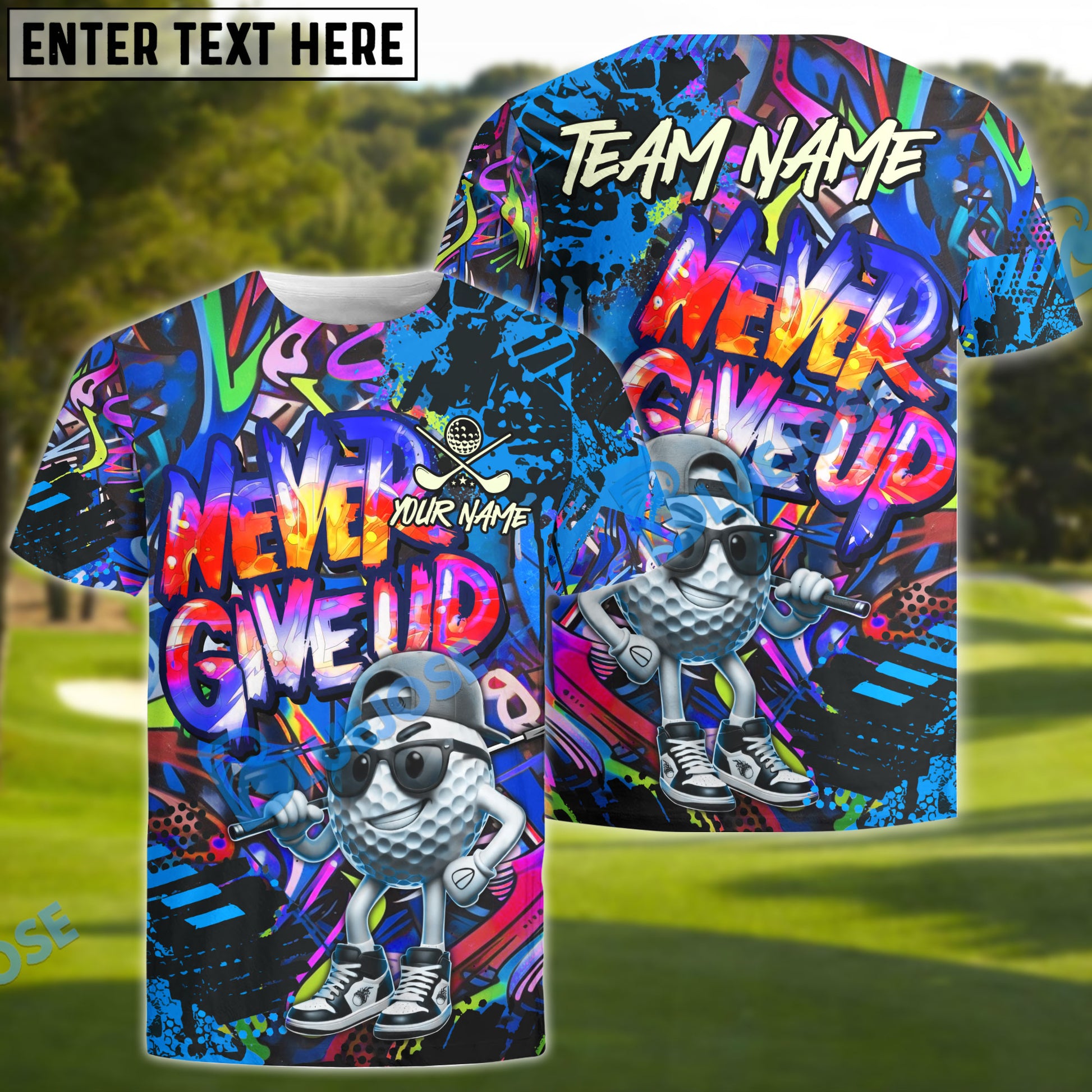 BlueJose Never Give Up Graffiti Pattern Golf Ball Multicolor Options Personalized Name, Team Name 3D Shirt (4 Colors)