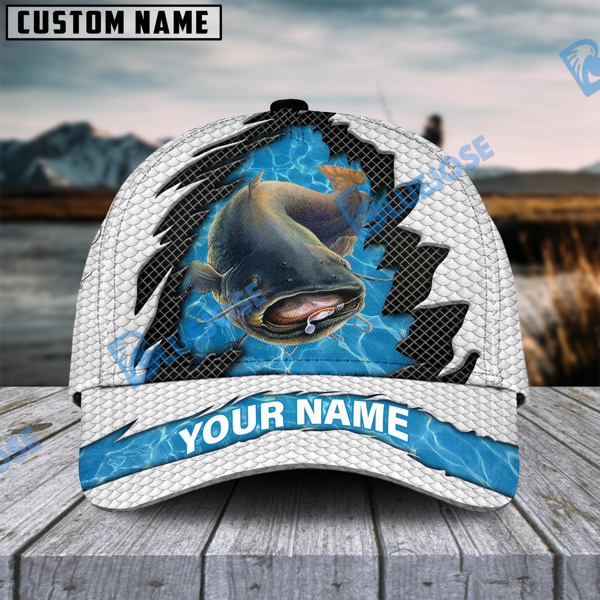 BlueJose Personalized Catfish Fishing White Blue Wave Fishnet Classic Cap