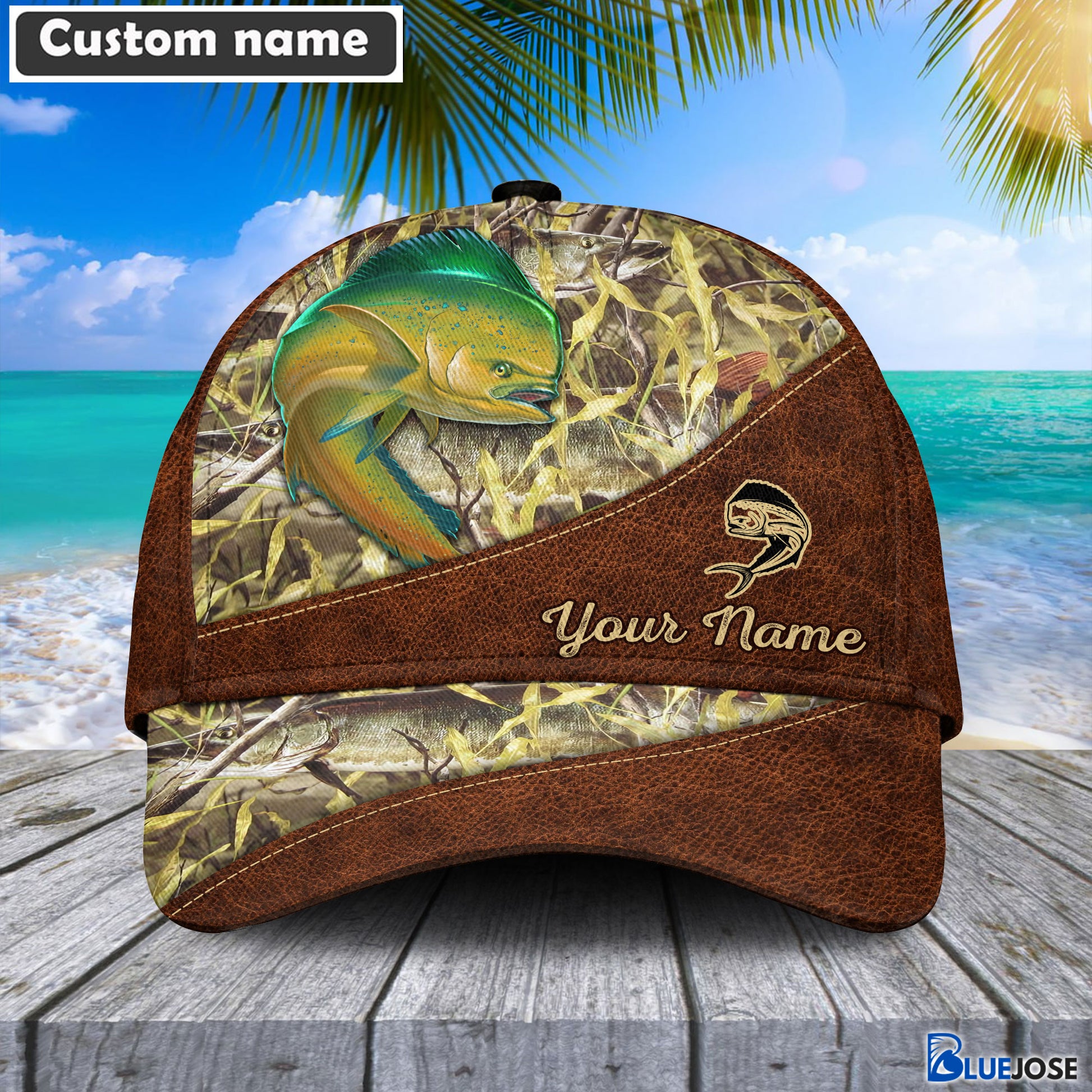 BlueJose Personalized Mahi Mahi Fishing Leather Pattern Cap