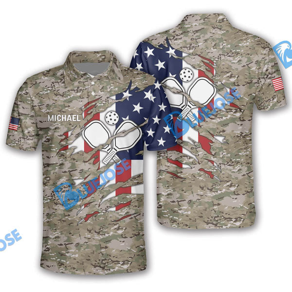BlueJose Personalized Name, Team Name Camouflage Flag Custom Pickleball 3D Shirt