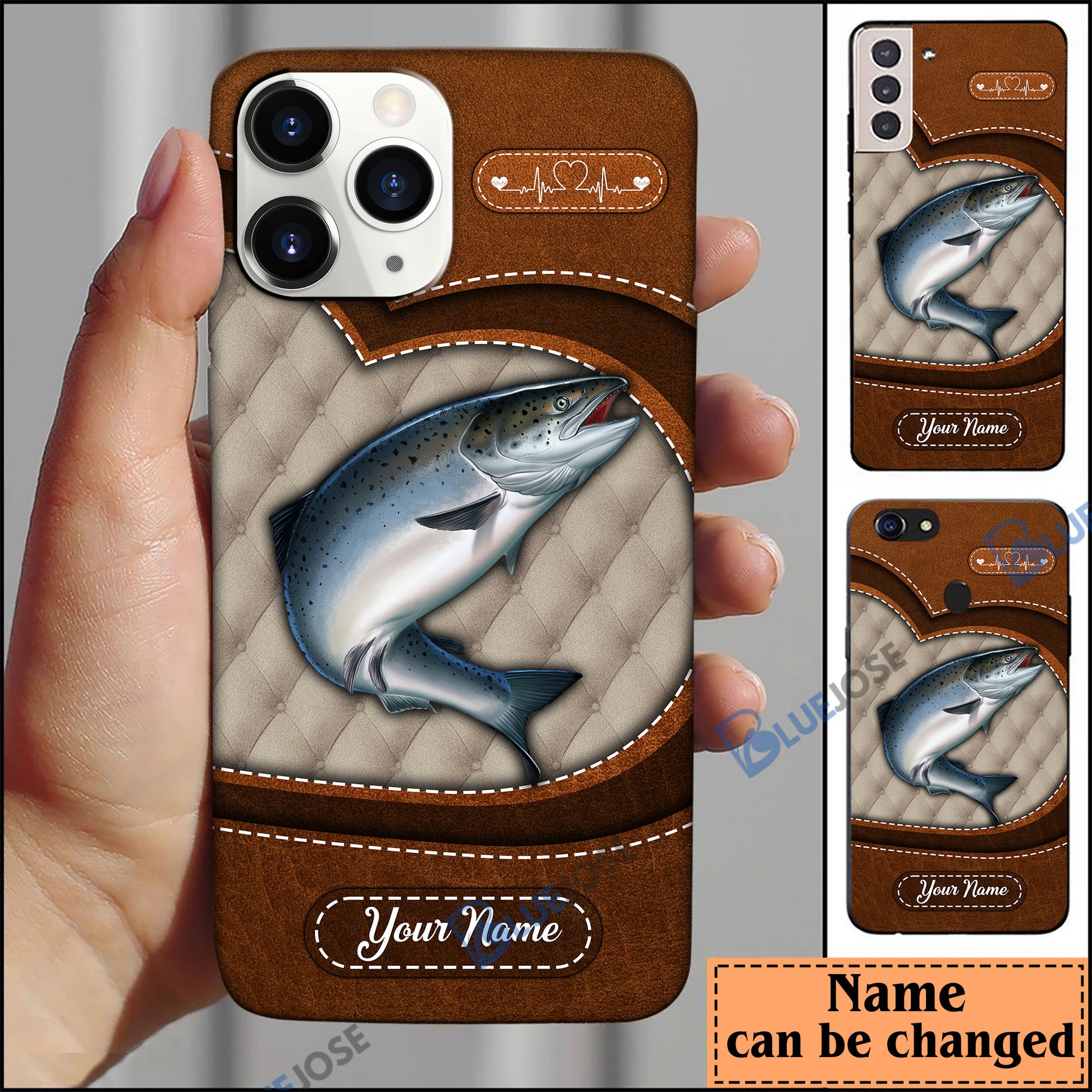 BlueJose Salmon Fish Heart Leather Pattern Personalized Name Phone Case