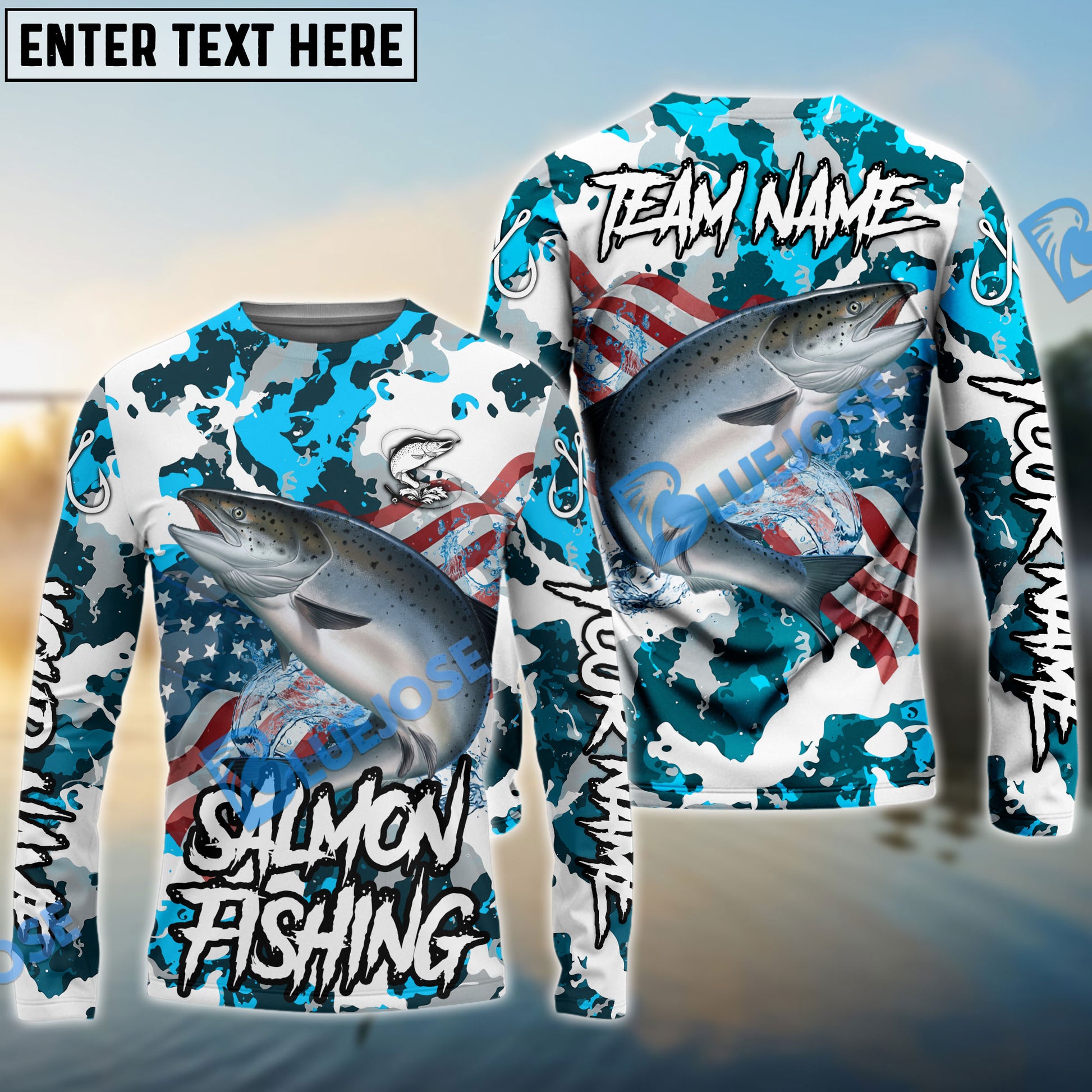 Bluejose Salmon Fishing American Flag Light Blue Camo Custom Name & Team Name 3D Shirts