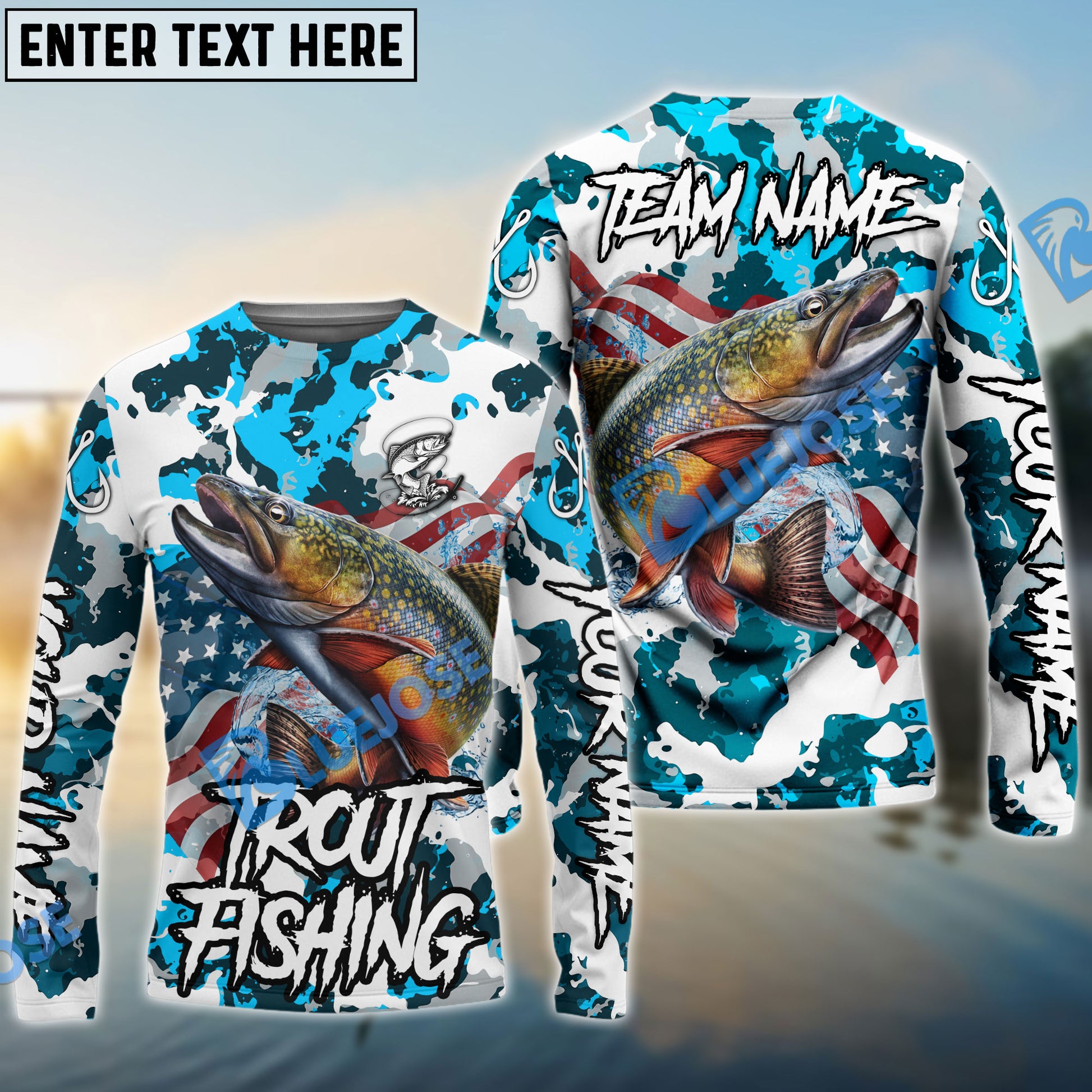 Bluejose Trout Fishing American Flag Light Blue Camo Custom Name & Team Name 3D Shirts