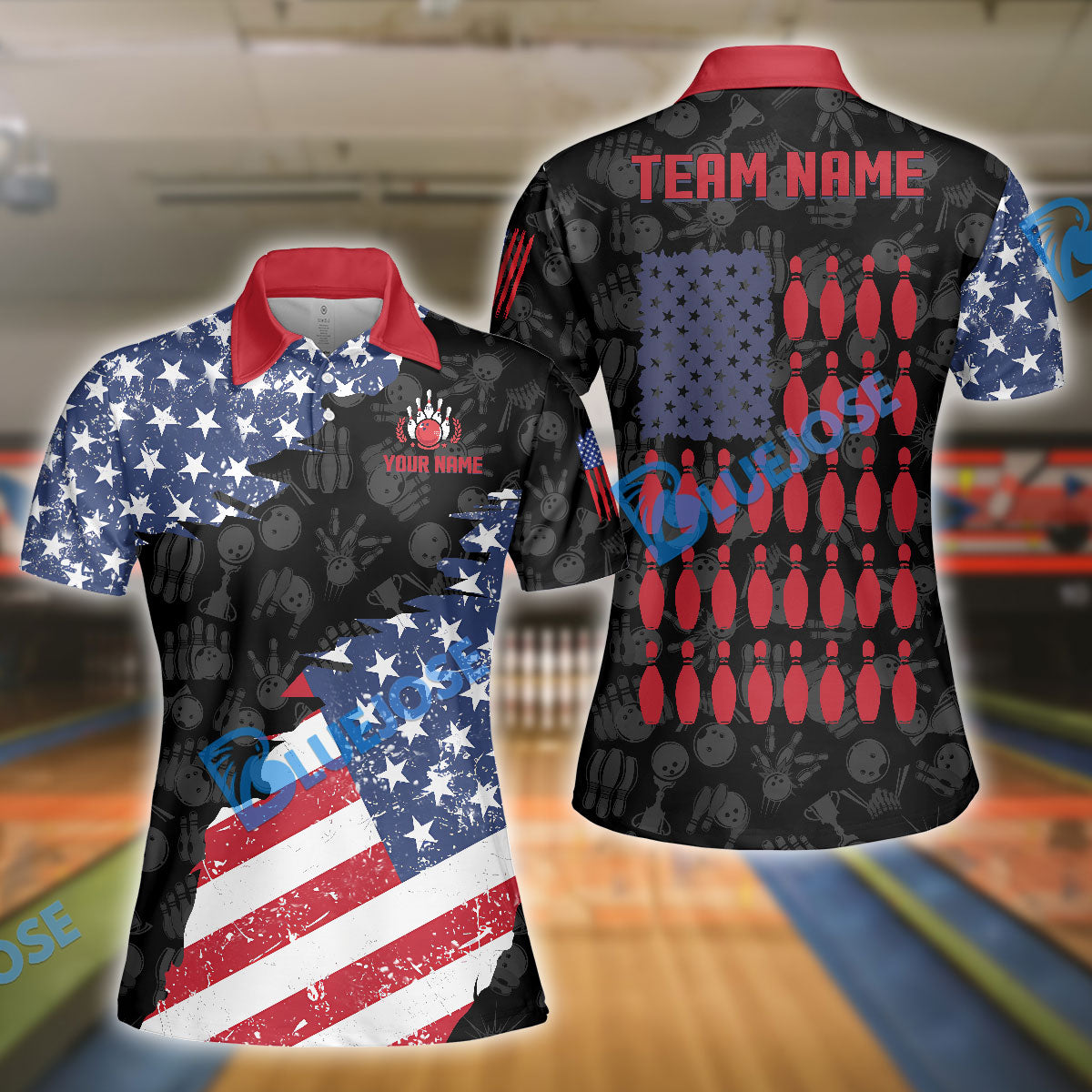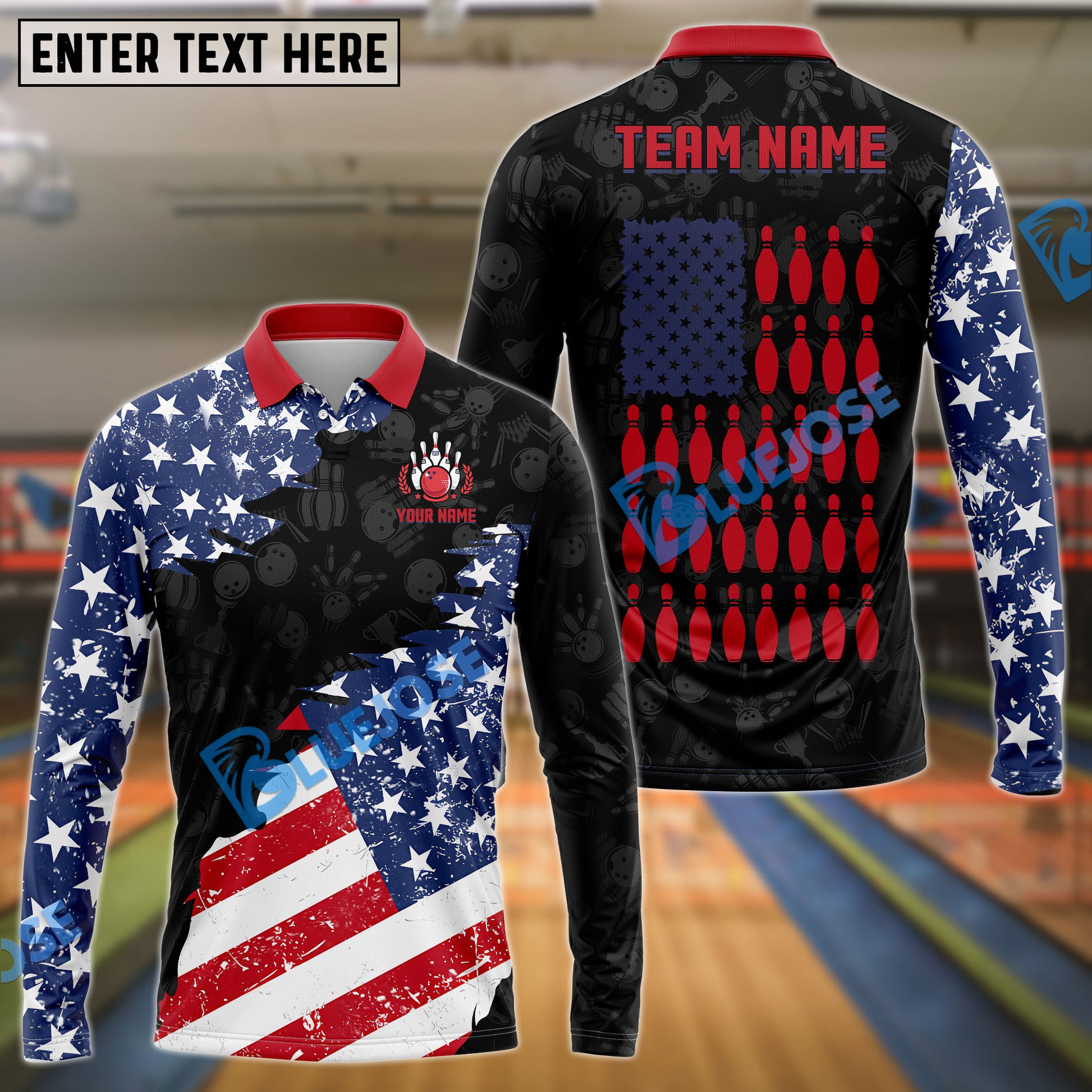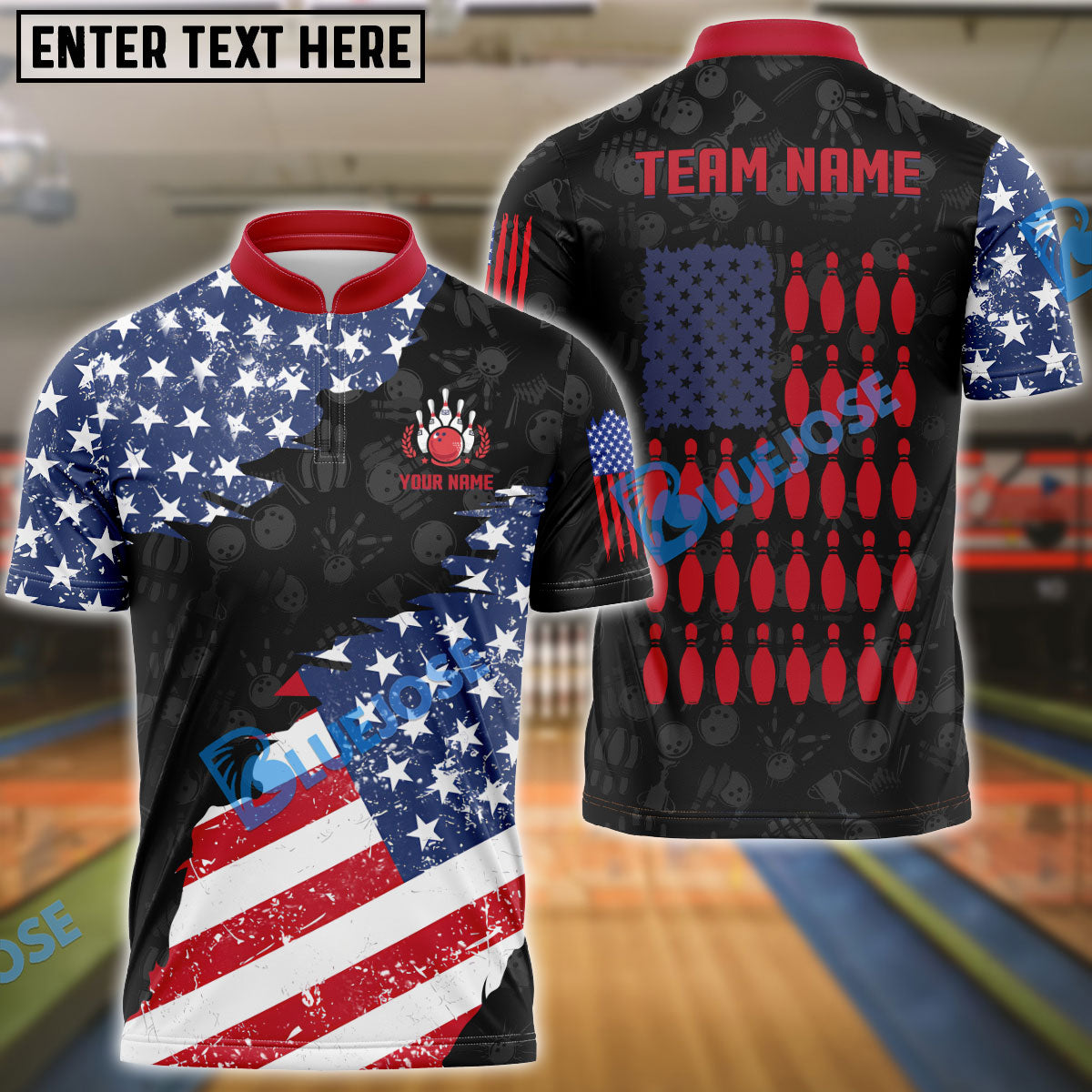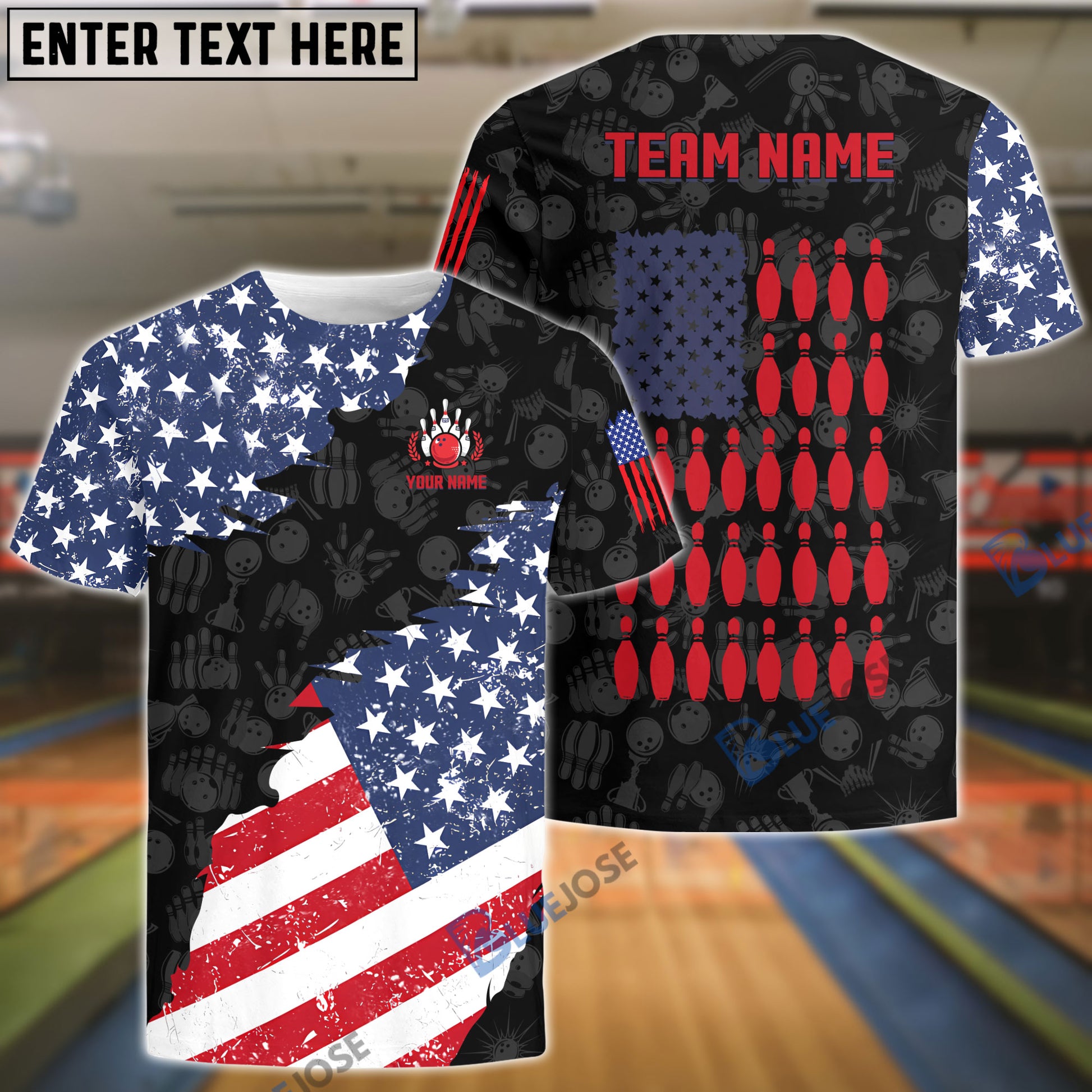 BlueJoses Bowling And Pins US Flag Bowling Pattern Customized Name, Team Name 3D Shirt (Black & White)
