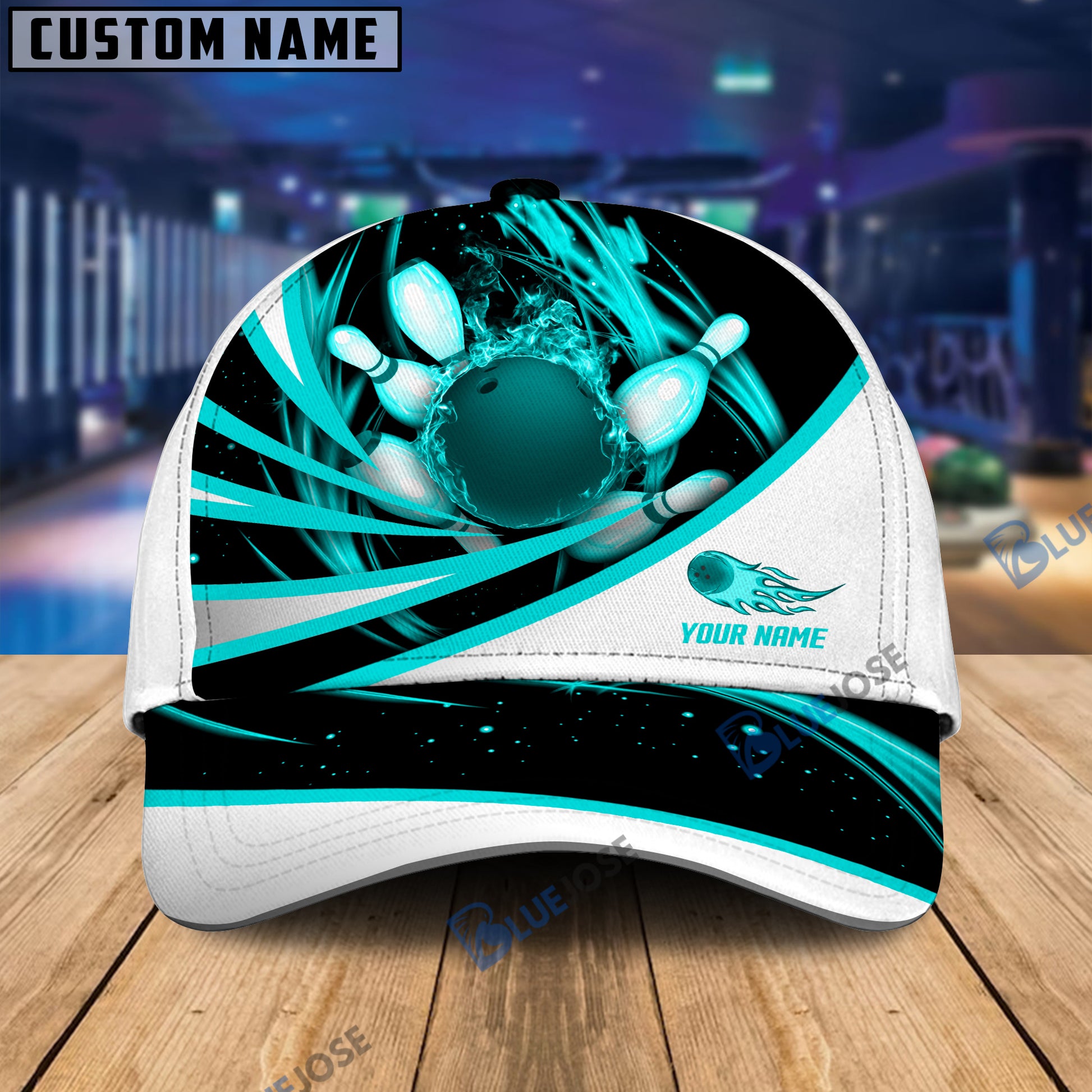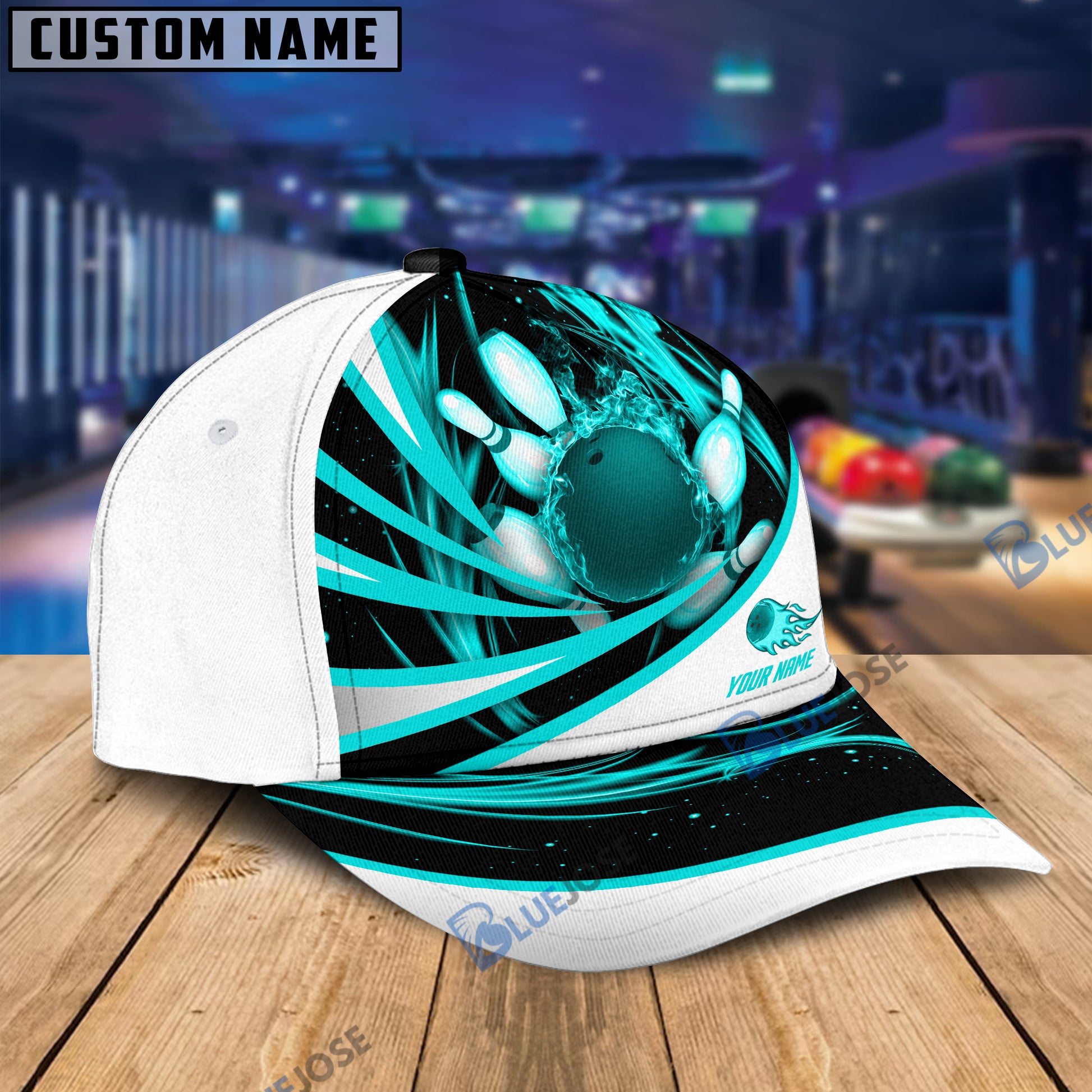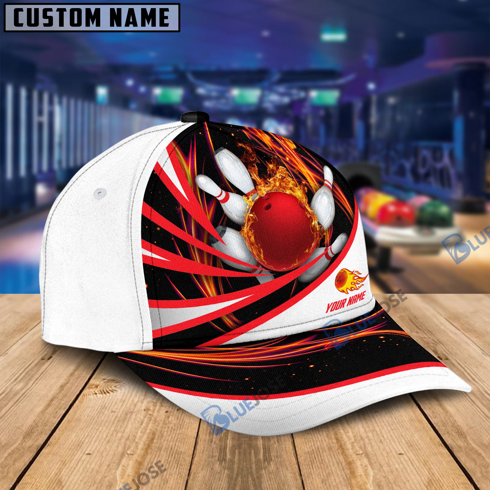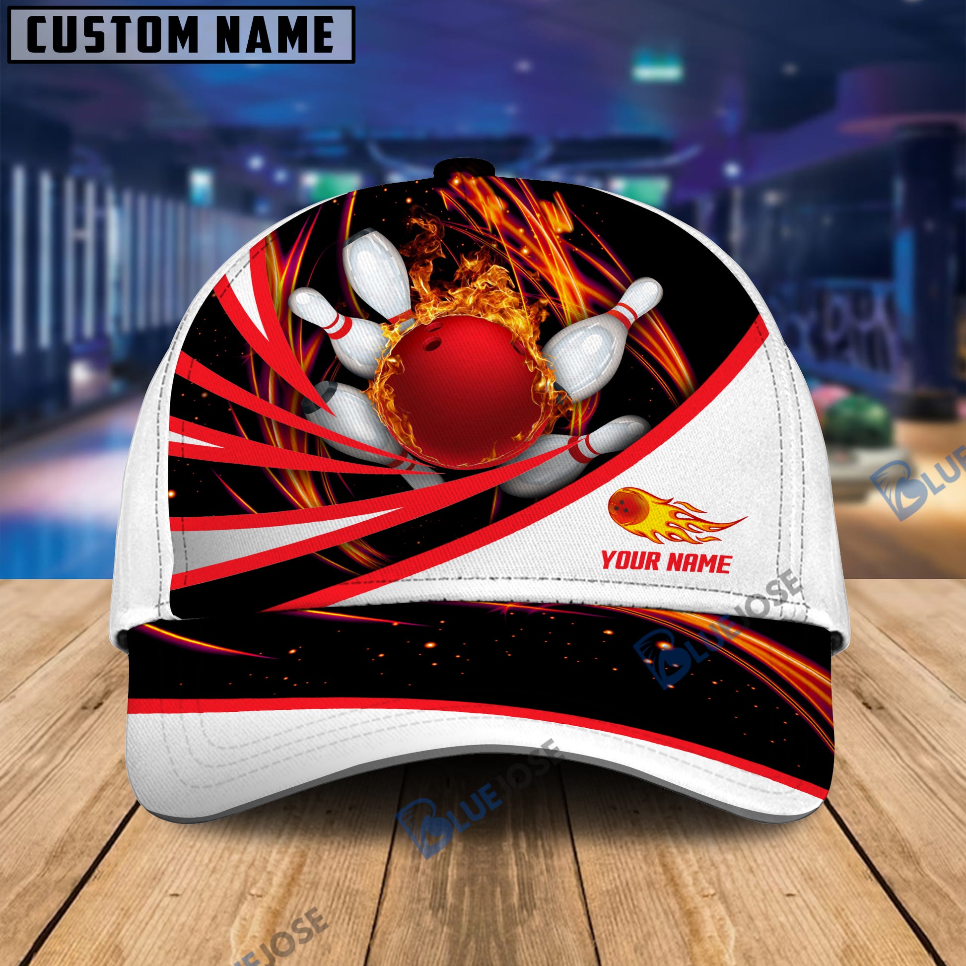 BlueJoses Flame Bowling And Pins Tornado Pattern Multicolor Personalized Name Cap