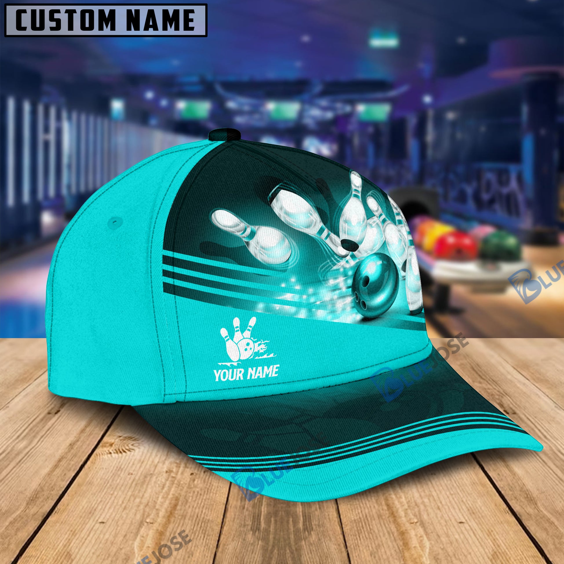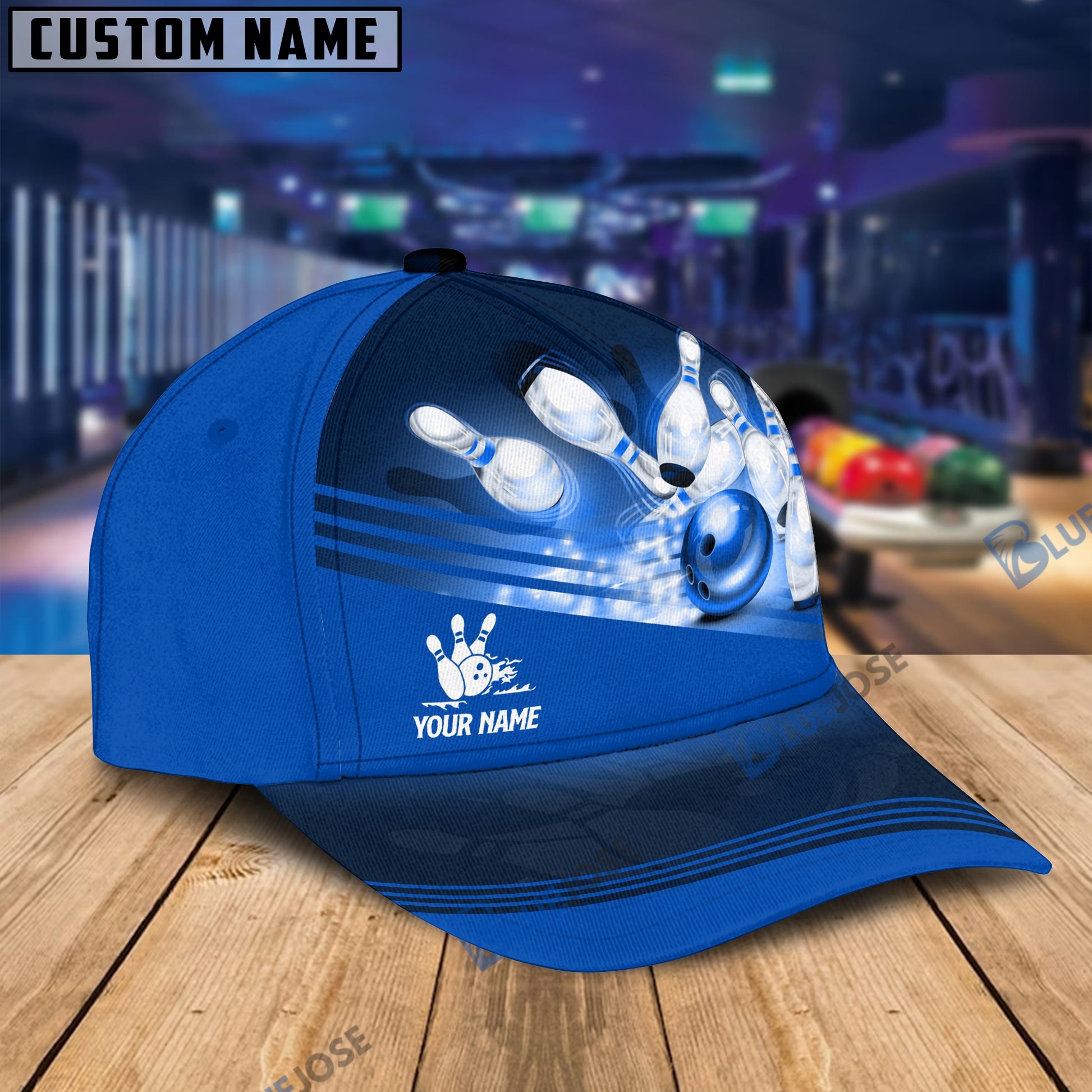 BlueJoses Red Bowling Ball Crashing into the Pins Personalized Name Cap