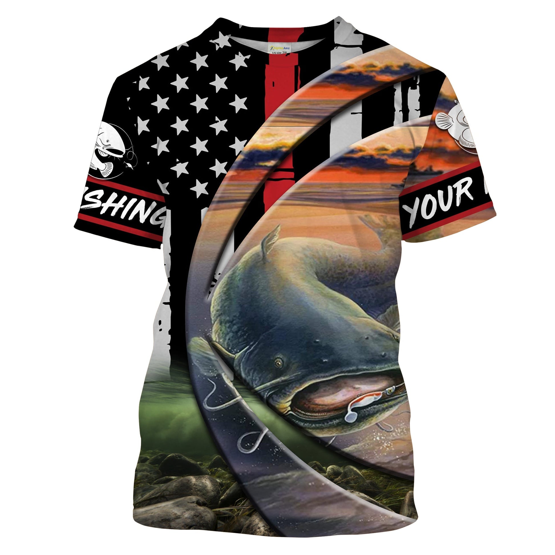 Bluejose Catfish Fishing American Flag Patriotic Fishing Customize Name Long Sleeves Fishing Shirts
