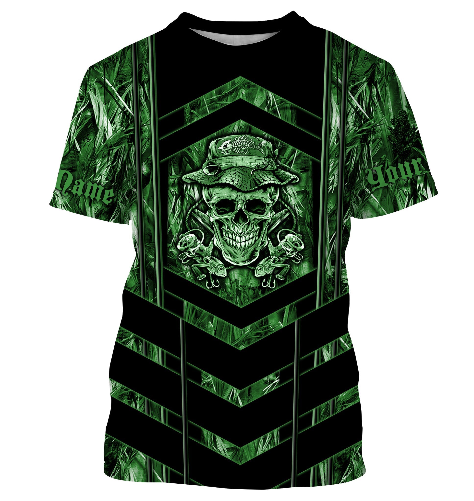 BlueJose Fish Reaper Green Camo Custom Name Fishing Shirt