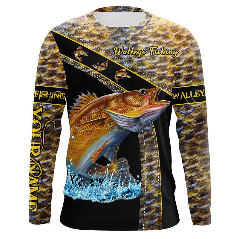 Bluejose Walleye Fishing Yellow Walleye Scales Custom Name Walleye Fishing Long Sleeve, Long Sleeve Hooded