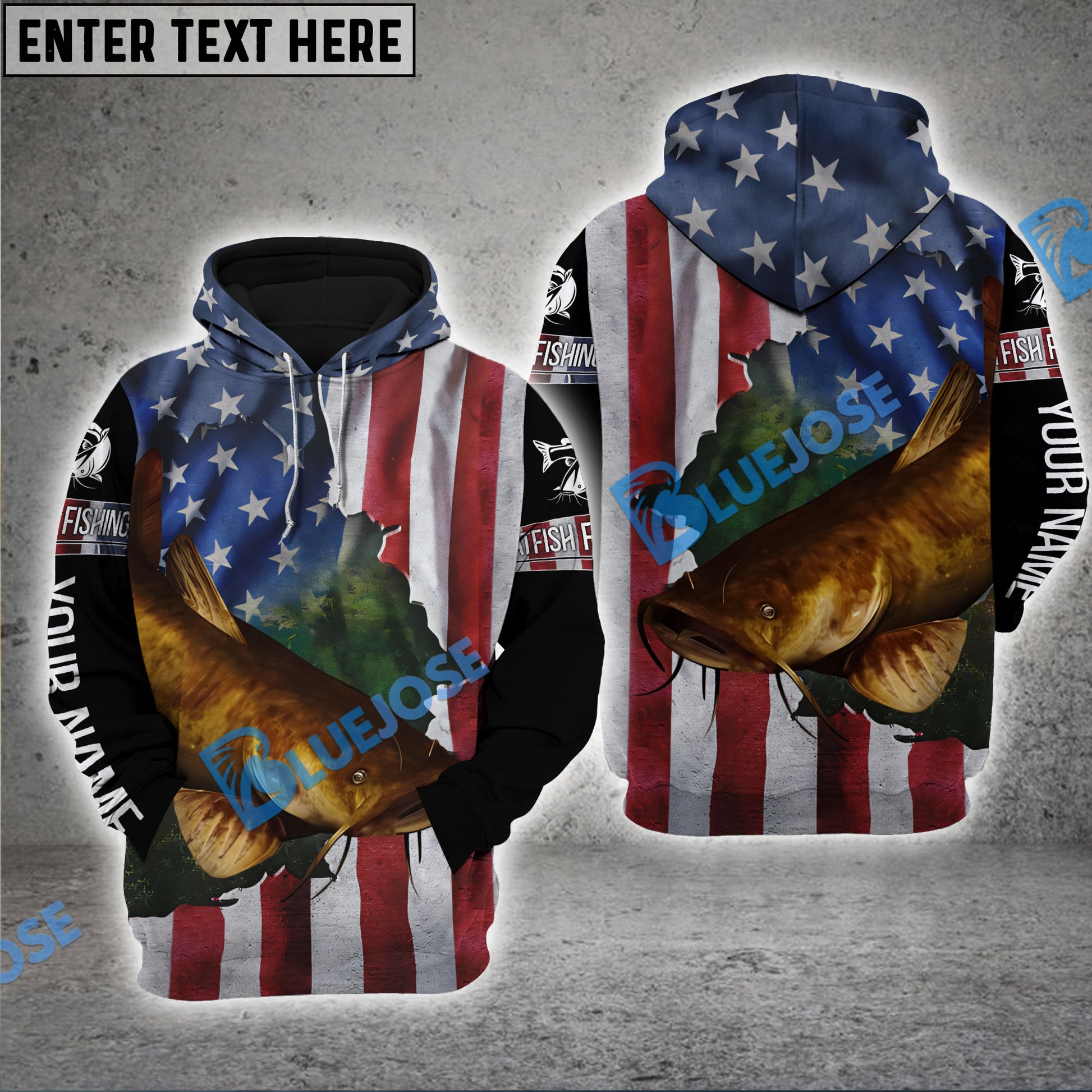 Bluejose Flathead Catfish Fishing American Flag Patriotic Personalized Catfish Long Sleeve Fishing Shirts