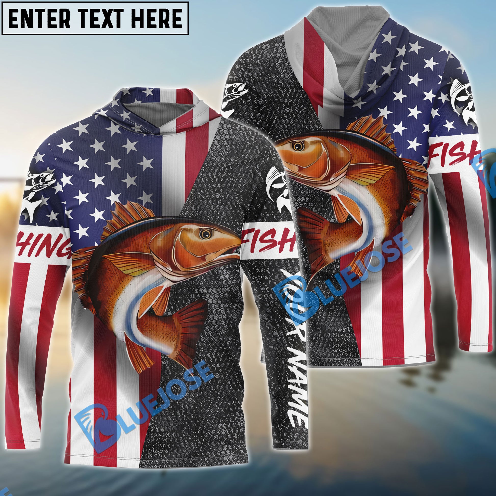 Bluejose American Flag Patriotic Redfish Fishing Jerseys, Personalized Red Drum Fishing Long Sleeve Shirts